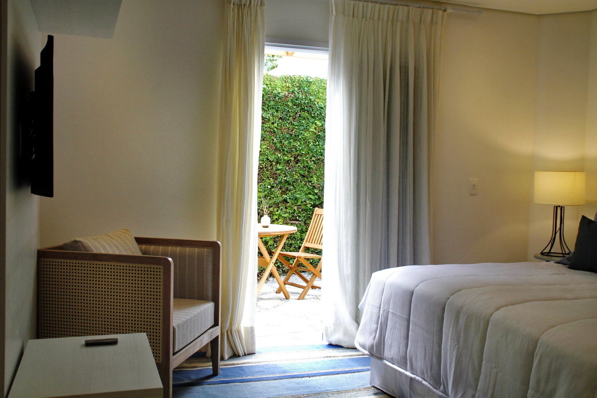 Categoria Luxo localizada no piso terro, conta com área verde privativa ideal para um café da manhã a dois. Na estrutura da suíte, confortável cama queen size , ar-condicionado, TV smart, enxoval 600 fios, além de ducha reconfortante em 32m.